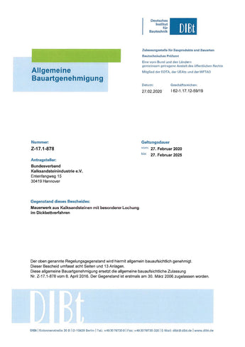 Allgemeine bauaufsichtliche Zulassung zur Anwendung von Mauerwerk aus Kalksandsteinen mit besonderer Lochung im Dickbettverfahren.