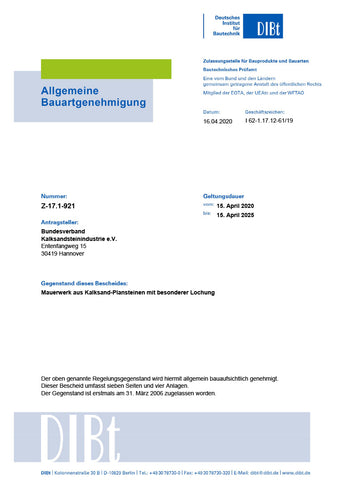 Allgemeine bauaufsichtliche Zulassung zur Anwendung von Mauerwerk aus Kalksand-Plansteinen mit besonderer Lochung.